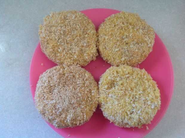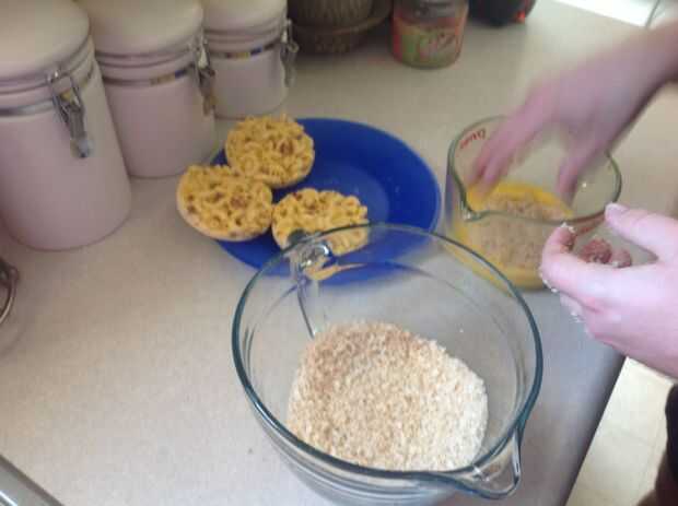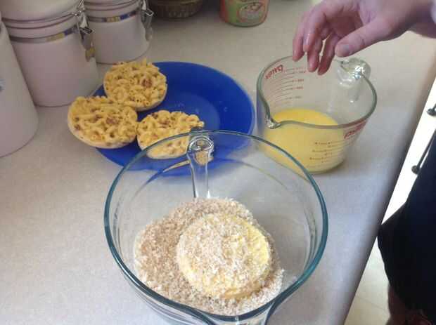 Batir el pan rallado con la paprika, Chile en polvo, pimienta negra, azúcar y pimienta en un plato poco profundo; dejar de lado. Batir los huevos con la leche 3 cucharadas en un recipiente pequeño. Quitar los "bollos" del congelador, capa en el lavado de huevo y luego dragar rebozado y luego repetir el proceso proporciona los macarrones una capa doble.
