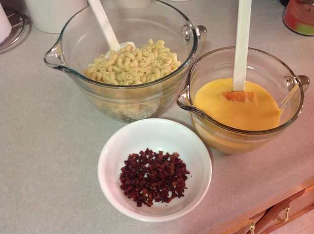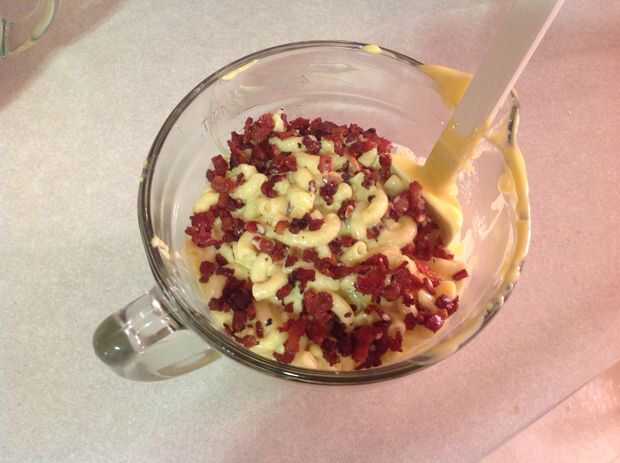 En un bol grande añadir escurridos los macarrones cocidos, salsa de queso y tocino desmenuzado.