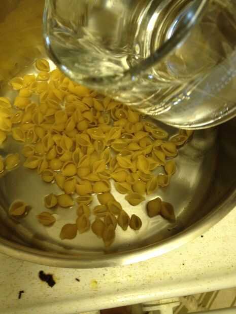 Añadir agua poco a poco hasta que la pasta se cuece. Vaciar el agua sobrante.