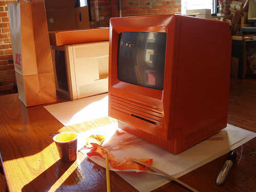 Dar tu viejo Mac una buena limpieza y luego la máscara fuera de la pantalla con la cinta. Utilizamos cinta de envío claro. Para la pintura, utiliza pintura en aerosol Krylon Fusion calabaza naranja. Empezamos con otro tipo de pintura, pero no se adhiere muy bien. La línea de fusión se hace especialmente para el plástico y funcionó muy bien.