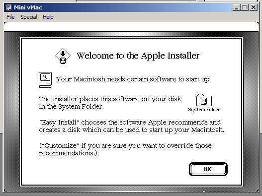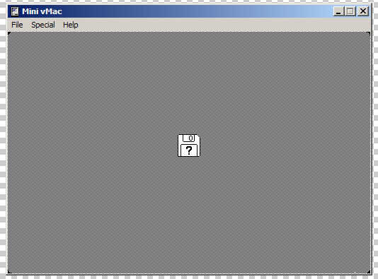 Ok abre el programa de mini vmac y obtendrá una pantalla con un disco y un "?". Eso significa que no hay ningún disco insertado ahora mismo. Así que para poner un disco de arrastre el archivo de imagen de 1 instalar en el emulador y se dicen Bienvenido a macintosh y traer un instalador.