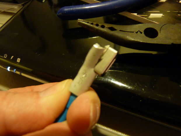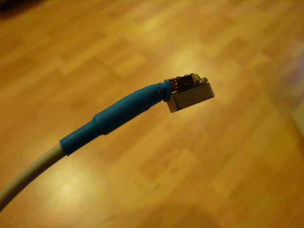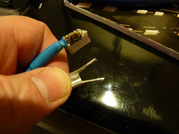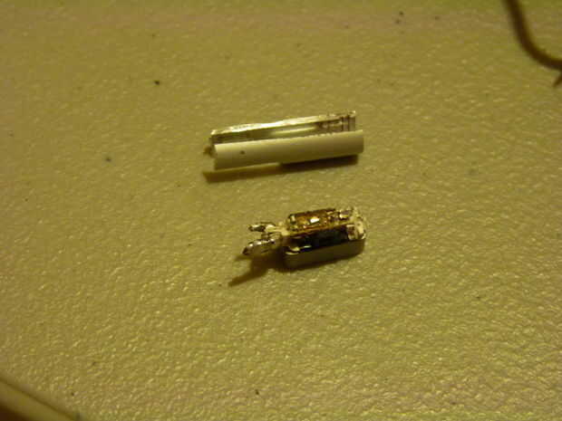 I poner un pequeño trozo de cinta aislante sobre la electrónica expuesta en la parte posterior del conector y vuelva a colocar la férula en lugar alrededor de todo. Apreté la férula alrededor todo un conjunto de pinzas, pero todavía había un boquete en la parte superior y la parte de atrás donde había cortado lejos del metal.