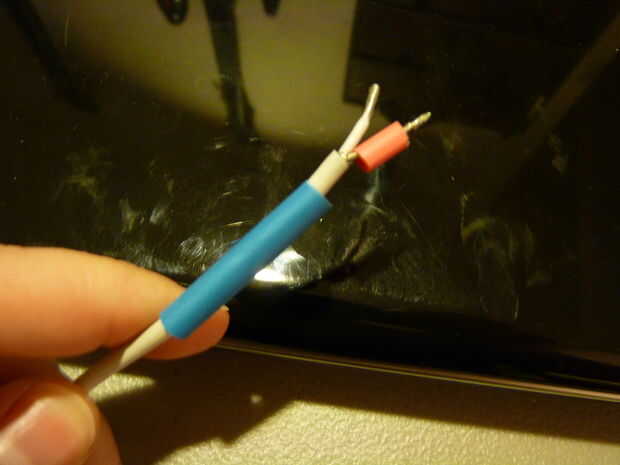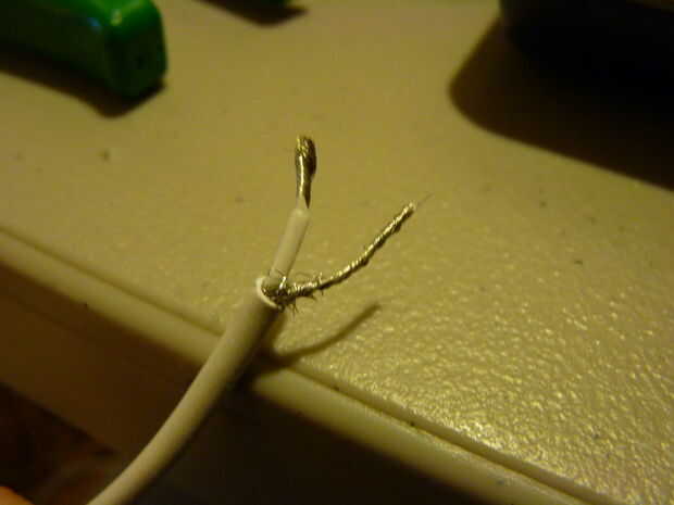 Después de rayas la chaqueta externa de cable de alimentación, vi que este cable se hace como el cable coaxial. Tiene una malla de alambre fuera otro cable aislado completamente. Sacó la malla de alambre y había trenzado hasta hacer un alambre regular. Decidí del encogimiento del calor-cierto aislamiento en el conductor desnudo para evitar cualquier cortos en la férula de aluminio cuando armé todo nuevamente.