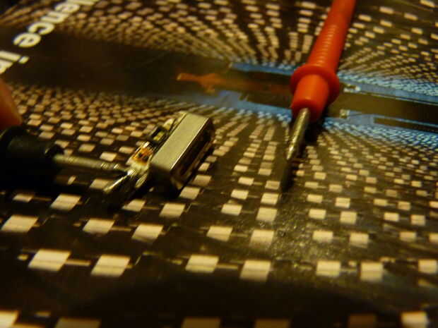 Estaño los cables para facilitar la soldadura en el extremo del conector. Con el conector en un ayudar a abrazadera de la mano, soldado los cables hasta el final del conector. Luego enchufa la fuente de alimentación de la pared y utiliza el medidor de voltaje otra vez para probar el voltaje. Según pinouts.ru, la tensión debe mostrar 6,86 VCC sin carga, que es lo que tengo cuando toca la conduce a un interno y un contacto externo en el conector.