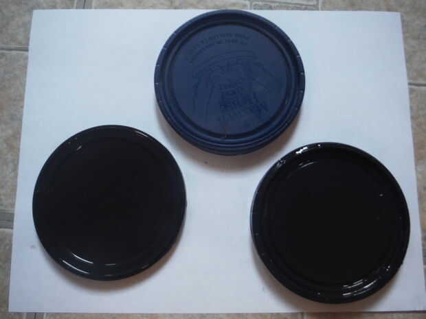 Decidí utilizar tapas de lata de café viejo y había pintado negro. He dejado algunas zonas sin pintar para crear un aspecto "antiguo" (como si les he tenido mucho tiempo) lo que me gustó de las tapas, era que ya eran decorativos y biselado. Por lo general la base pegaremos a mitad de una pulgada alrededor de todo el camino. Si no tienes alguna latas de café colocar alrededor, también puede utilizar madera, posavasos o incluso cartón.