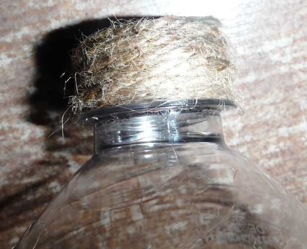 Hacer un nudo en la parte superior del cuello de la botella y comenzar a envolver el yute alrededor del cuello varias veces hasta que se cubra totalmente. Usé yute porque conserva un aspecto muy rústico y textura.
