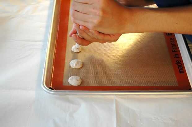 Si esta es la primera vez que usted está haciendo estos (o usted tiene un mal caso de TOC) puede trazar círculos en la parte inferior del pergamino para el tamaño de su macarrón. Suelo ir de 1.5 pulgadas de diámetro, aunque fácilmente podría hacer más grandes. Tubo tan uniformemente como sea posible para evitar la cocción dispareja.