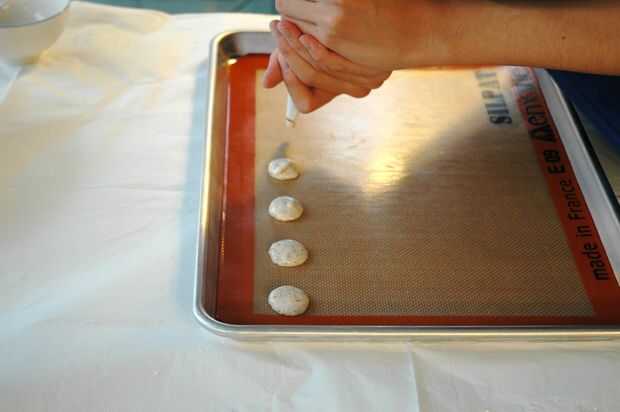 Técnica: cuando tuberías, asegúrese de que la Manga pastelera es perfectamente vertical y perpendicular a la placa para hornear. Sostenga sobre un centímetro por encima de la hoja. Para garantizar la uniformidad, siempre apriete con la misma presión de la mano y contar cuánto tiempo tarda en pipa cada uno redondo (generalmente alrededor de 2 segundos).