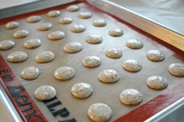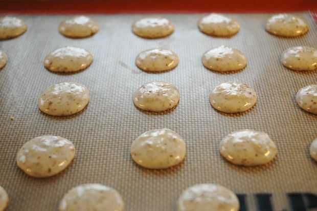 Descanso: después de que tubo las cáscaras de macarrón, dejarlos reposar unos minutos antes de ponerlos en el horno. Así, tienen una oportunidad para empezar a desarrollar proyectiles antes de que incluso les hornea. Mi regla es solamente precalentar mi horno después las conchas han sido entubadas. Cuando mi horno está listo, así son los macarons.
