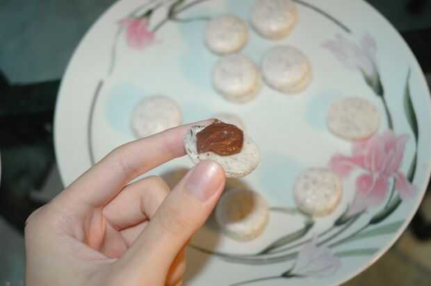 Para rellenar los macarons, simplemente coger un cuchillo de la mantequilla y unte en un macarrón de cada par. Si quieres ser mejor sobre él, sin duda puede tubo la ganache. Les tapa y tus macarons son montados!