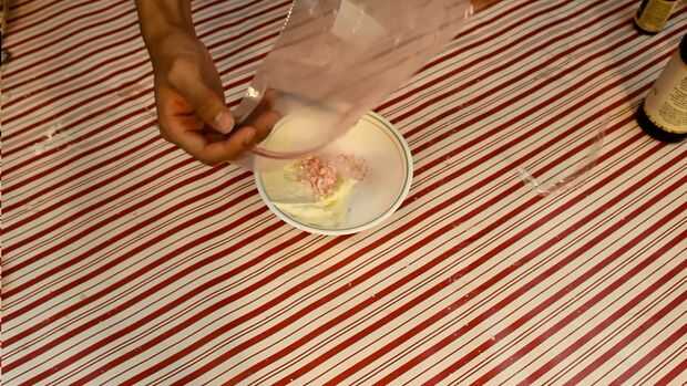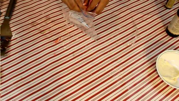 En una batidora, batir la mantequilla (que debe estar a temperatura ambiente) hasta agradable y cremoso. Tamizar la mitad de su nivel de azúcar en polvo y siga batiendo, ahora a baja velocidad. Tamizar en su segunda mitad y continúe batiendo. Una vez que el azúcar está totalmente incorporado, añadir el extracto de vainilla y si es necesario, la crema de leche para hacer la crema de la consistencia adecuada. Luego, desenrolle un bastón de caramelo tamaño estándar y romper en trozos pequeños dentro de una bolsa de plástico capaz de sello. Usando un agolpamiento de objeto pesado (como un ablandador de carne o martillo) su bastón de caramelo en polvos pedacitos. Añadir su bastón de caramelo picado en la mantequilla y mezclar hasta incorporar bien. Pequeñas tiradas de bastón de caramelo están bien y añadir un buen crujido.