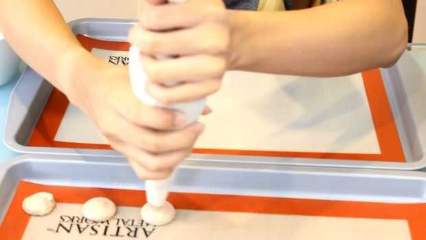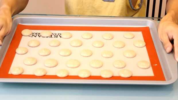 Llene la mezcla en una manga pastelera con una punta redonda grande. Tubo mezcla en cuarto tamaño montículos sobre esteras o papel de pergamino de la hornada. Aprovechar las hojas para hornear sobre un mostrador un par de veces a fina a cookies y eliminar burbujas de aire grandes. Luego simplemente dejar que las cacerolas sentarse por 30 minutos o más, o hasta que se forme piel o cáscara sobre las galletas.