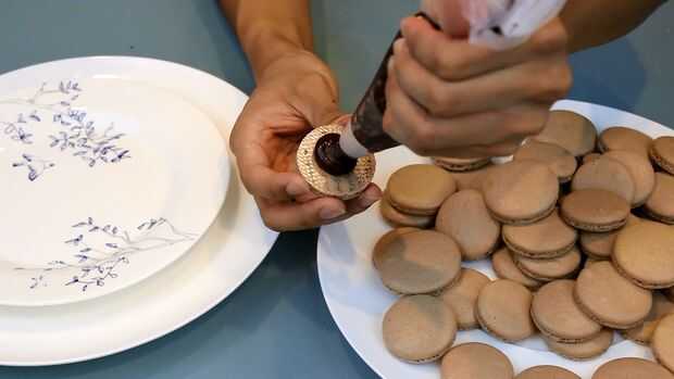 Vierta el ganache espesa en una manga pastelera con una punta redonda grande y tubo un pequeño montículo en el centro de una galleta de macaron. Sándwich con otra galleta, y ahí lo tienen, una galleta de macaron completo.