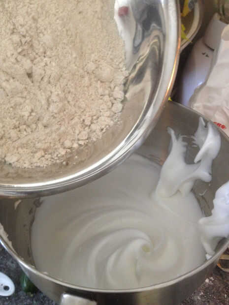 Batir claras de huevo hasta que estén espumosos a velocidad media alta y luego agregar azúcar baya un poco a la vez, beat hasta picos firmes (5-7 minutos) - la idea es incluso cuando usted voltee su tazón de la batidora, el huevo no deslice