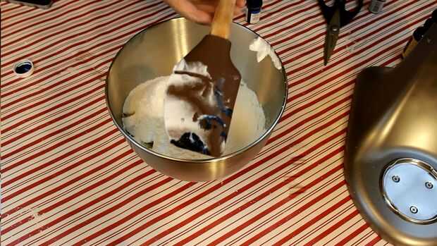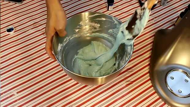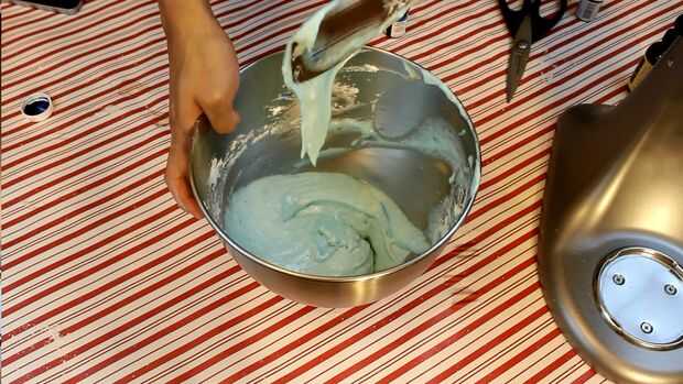 Añadir el extracto de almendra a la mezcla de huevo, pero no todavía. Tamizar sus ingredientes secos. Tomar el colorante de alimento y frote sobre la espátula de silicona. Luego, doblar suavemente los ingredientes juntos con esa espátula. Esto crea trazos azul bonitos. Debe formar una mezcla espesa y suave que se asemeja a la lava fundida. Al levantar la espátula fuera de la vasija, la mezcla debe agrupan hacia abajo en lugar de cinta suavemente, y su masa debe fluir lentamente hacia la forma del recipiente. Para obtener más ayuda, por favor ver el video.