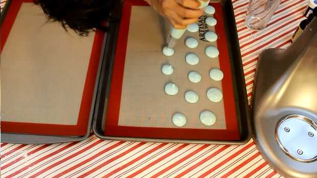 Llene la mezcla en una manga pastelera con una punta circular grande medio. Tubería en hojas de papel o silicona de pergamino como ligeramente más grande que montículos de tamaño cuarto. Toque sus hojas sobre una superficie dura hasta que las burbujas de aire aumento de la masa, y las cookies alcanzan el espesor adecuado. Permitir que tus macarons se seque antes de hornear. Para aumentar la tasa de secado en climas húmedos, soplar un ventilador sobre sus hojas. Sus macarons no deben atenerse en todo a su dedo cuando se toca.