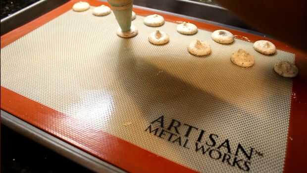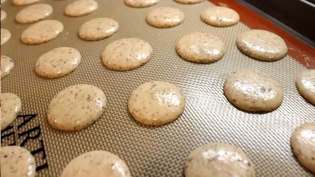 Llene la mezcla en una manga pastelera con una punta circular grande. Cuarto pequeño tubo tamaño montículos en papel pergamino o silicona para hornear esteras. Entonces, bang las hojas sobre un mostrador varias veces para eliminar las burbujas de aire y para aplanar los macarons para el espesor ideal. Queremos que los macarons que pequeños discos planos. Permita que los macarons se siente en un contador de al menos 30-60 minutos para secar. Los macarons están listos para hornear cuando el crack no al tacto.