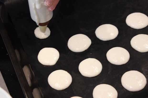 Pierna een stuk bakpapier op een ovenplaat. Giet het macaronbeslag van de spuitzak en maak hierbij cirkels de een alrededor de 4cm de diámetro de als.