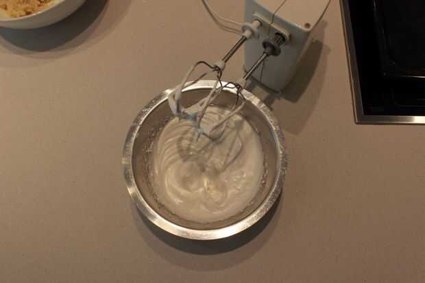 Neem nu een andere kom en sintonía de 2 overgebleven eiwitten met de 35 g suiker stijf tot een gran schuim.
