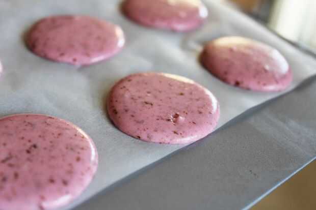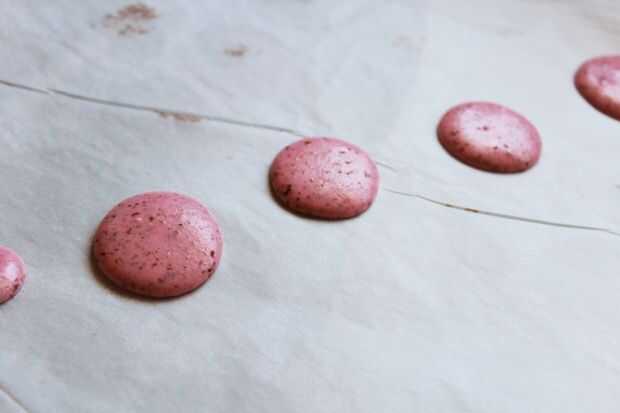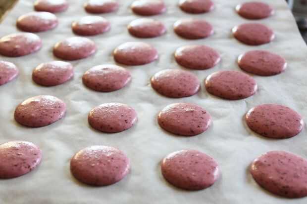 Después de que termines de tuberías, bang la bandeja sobre la mesa para sacar las burbujas de aire. Esto también ayuda a suavizar la superficie de tus macarons!