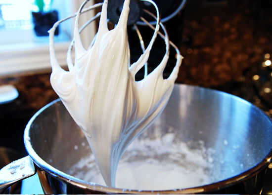 En una cacerola a fuego mediano, poner agua y azúcar (250 g) (65 g) a hervir. Deje para cocinar hasta que llegue a 115' C (etapa suave de la bola) en un termómetro de caramelo. En el recipiente de una batidora, comenzar a batir las claras de huevo (90g) a una velocidad moderada, Vierta lentamente el jarabe hirviendo. Aumentar la velocidad moderadamente rápido y batir hasta enfriar y la rígida forma claras de huevo, brillantes, picos destacados.
