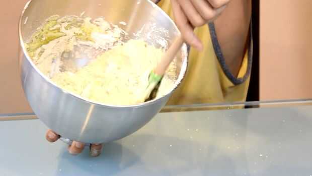 Tamice los ingredientes secos en la mezcla de huevo. Asegúrese de desechar cualquier trozos grandes que no lo hacen aunque el tamiz. Doblar suavemente los ingredientes secos a la mezcla de huevo hasta que la mezcla se asemeja a la lava fundida. Cuando levantado fuera de la vasija, la mezcla debe cinta irregularmente, pero derrite lentamente en la mezcla a granel (una vez más, vea los videos en el canal de YouTube de ayuda).