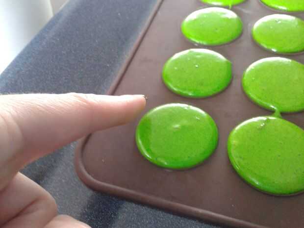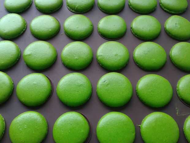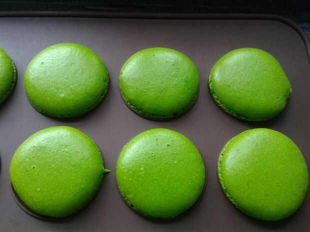 Precalentar el horno a 160 º C (320 º f) y 2 estantes en la parte inferior del horno. Línea 2 las hojas para hornear con papel pergamino. Si tienes tiempo, dibujar círculos de 1 pulgada en la parte posterior de cada hoja, espaciando los círculos de por lo menos 1/2 pulgada aparte. Si la harina de almendra es muy gruesa, moler con el azúcar en polvo en un procesador de alimentos hasta el fina. Tamizar la mezcla de azúcar en polvo harina de almendras dos veces a través de un tamiz de malla. Añadir el colorante verde y el perifollo. Colocar las claras de huevo en el cuenco de una batidora (o usar una batidora de mano como lo hago yo) y comenzar a vencer en medio-alto. Cuando están espumosos los huevos, añadiendo azúcar granulada 1 cucharada por vez hasta completamente incorporado. Continuar a batir la mezcla de clara de huevo hasta que se formen picos brillante y rígida al levantar los batidores. Tenga cuidado de no overbeat el merengue (p. ej., el merengue adquiere una textura clumpy). Agregue la mitad de la mezcla de almendras cernida y dóblelo suavemente en el merengue con una espátula de silicona flexible. Levante de la parte inferior, alrededor de los lados y hacia el centro, teniendo cuidado de no overagitate el merengue y perder el exceso de aire. Una vez predominante se incorpora la mezcla de almendras, agregue la segunda mitad y repetir el movimiento de plegado. Cuando sólo se incorpora la mezcla de almendra, necesita transformar la masa en la textura adecuada. Usando la parte plana de la espátula, "aplaste" en el centro de la masa, luego raspar más masa de los lados al centro y golpear otra vez. Usted tendrá que repetir esta acción 10 - 15 veces (o más, dependiendo de su fuerza en los brazos y la textura del principio de su masa) hasta que la masa lentamente y continuamente gotea en la taza cuando usted pala para arriba con la espátula. Pensar en la consistencia de la lava fundida. Para los mejores resultados, sacador de la masa unas cuantas veces, verifique la consistencia, luego perforar un par de veces más, etc. No hacen la masa demasiado líquida o los macarons no levantan como deberían. Verter la mezcla en una manga pastelera con una punta de 0.4 pulgadas. En un apuro, también se puede utilizar una bolsa de Ziploc de galones: cortar solo un pedacito pequeñito de una de las esquinas inferiores. Giro y clip de la bolsa para evitar desbordamiento. En su tubo preparado para hornear hojas (o láminas de macarrón de silicona) a cabo rondas de 1 pulgada en los círculos dibujó (Recuerde que dibujar los círculos en la parte posterior de su pergamino para evitar que la tinta o manchas de lápiz en tus macarons). Sosteniendo la bandeja para hornear en ambas manos, rap cada bandeja para hornear con firmeza en los tiempos de mostrador, dos o tres. Esto suaviza las puntas y ayuda a formar "papamoscas" o con el pie en los fondos de los macarons. Permita que los macarons por cañerías que se seque, sin cubrir, durante al menos 15 minutos. Los macarons deben formar una corteza muy delgada y lisa, donde, si usted golpee ligeramente con el dedo, la masa no se pegue a su dedo. Si después de 15 minutos, la masa es pegajosa aún, deje que se seque más. Esto puede tomar hasta una hora en días húmedos. Coloque dos hojas para hornear en el horno y hornear durante 12 minutos. Después de los primeros 2 minutos, abrir el horno para permitir que cualquier exceso de humedad escapar. A mitad de camino, cambiar parrillas del horno y gire las hojas para hornear incluso. Los macarons se hacen cuando se cuecen al horno a través de todo el camino y las cáscaras son difíciles. Tenga cuidado de no underbake (interior seguirá siendo blanda) o sobrehorneado (tapas empezará a dorarse). Sacar del horno y enfriar en hornear a una rejilla de alambre. Cuando haya enfriado completamente, montar los macarons con la opción de relleno. Los macarons montados puede guardarse en un recipiente hermético en el refrigerador hasta por una semana.