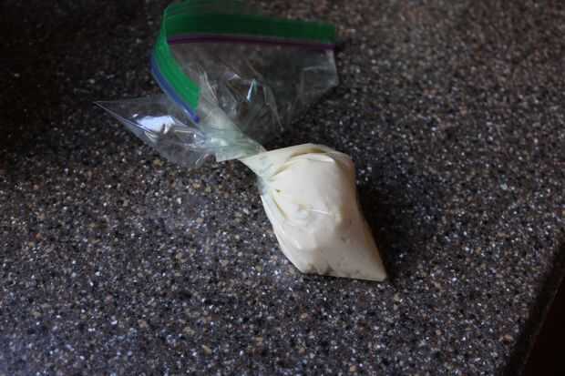 Cuchara el relleno en la Manga pastelera y cortar un pequeño Consejo fuera del final.