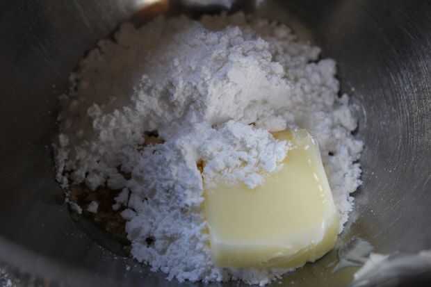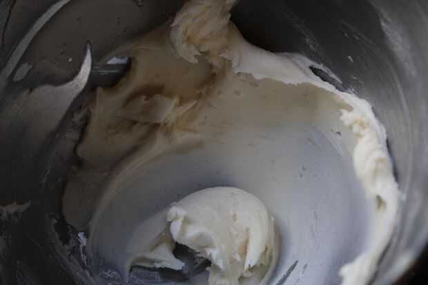 Mientras que el segundo lote está horneando, puedes hacer el relleno. Mezcle con una batidora la mantequilla, azúcar en polvo y extracto de vainilla.