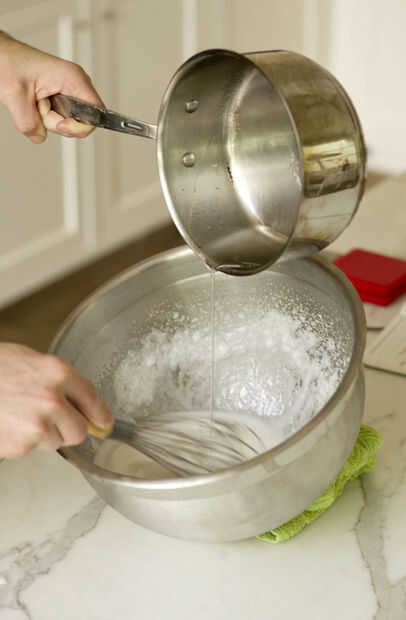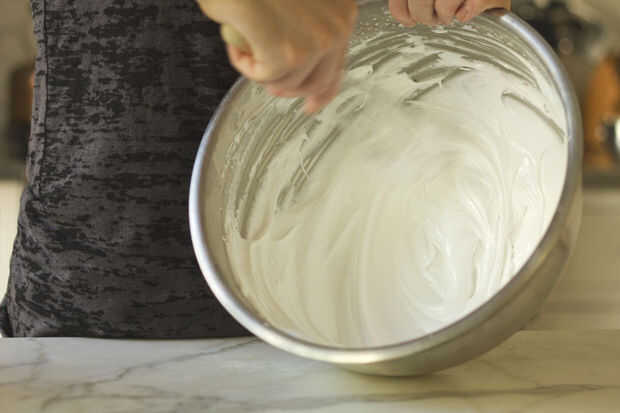 Añadir el jarabe de agua y azúcar a las claras de huevo acolchadas y batir con un batidor hasta que se enfríe.