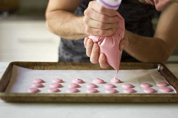 Poner la mezcla en Manga pastelera (o ziplock) y comenzar la tubería sobre una placa para horno forrada con. Deje que las galletas colocar y slam la bandeja un par de veces en el mostrador para liberar las burbujas de aire de la mezcla, luego dejar secar durante 30 minutos.