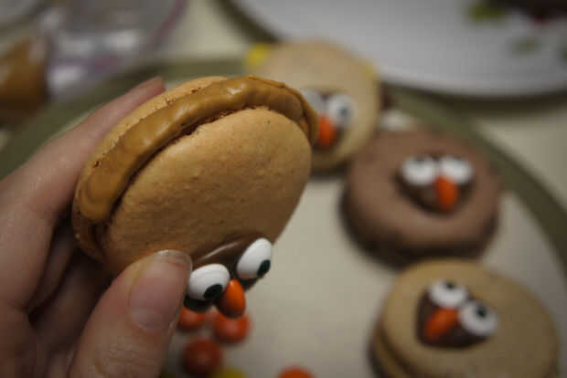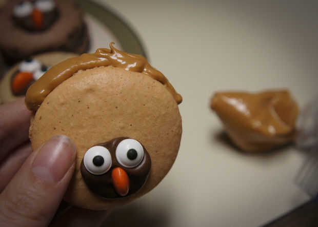 Fundir más de las virutas de caramelo y con una pipeta, crear una línea de caramelo derretido a lo largo de un borde del macaron.