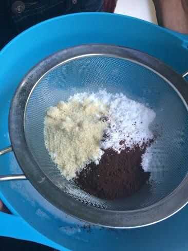 Tamizar en la harina de almendra, azúcar cacao y hielo y doblar en la mezcla de huevo con una cuchara de madera. Bolsa de mezcla de la cuchara en la tubería, si no tienes una manga pastelera en mano a corta una esquina de una bolsa zip lock y que funciona bien. Tubería en rondas de 4cm, hemos utilizado una bandeja especializada para esto pero usted puede simplemente dibujar fácilmente las rondas en una hoja de papel del forro y de uso que.