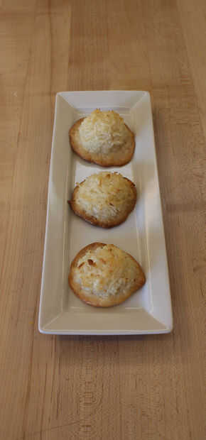 ingredientes-2,5 tazas de coco rallado, sin azúcar-2 huevos enteros-1 cucharadita de vainilla-pinch de sal-1/3 taza de azúcar-chocolate negro para decorarInstrucciones1. Precaliente el horno a 350F.2. mezclar todo excepto el chocolate junto.3. Utilic