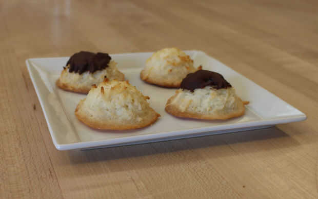 ingredientes-2,5 tazas de coco rallado, sin azúcar-2 huevos enteros-1 cucharadita de vainilla-pinch de sal-1/3 taza de azúcar-chocolate negro para decorarInstrucciones1. Precaliente el horno a 350F.2. mezclar todo excepto el chocolate junto.3. Utilic