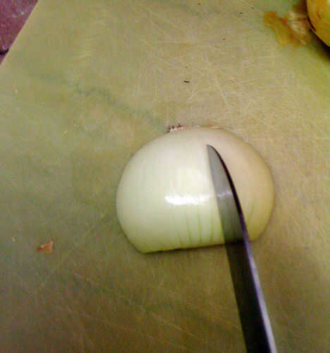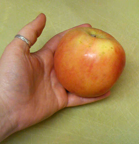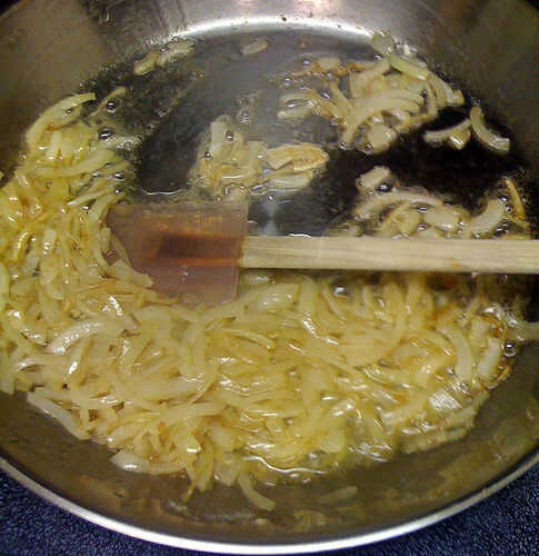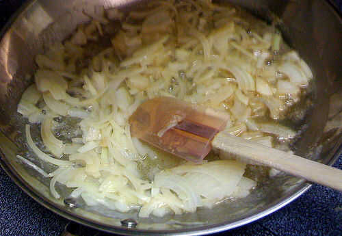 Mientras que la cebolla se cocina, pelar, núcleo y rallar la manzana. Agregar la manzana a las cebollas cuando las cebollas son bastante marrón para su gusto. Cocer la manzana con la cebolla hasta que se ablande la manzana y la mayor parte del agua evaporada.