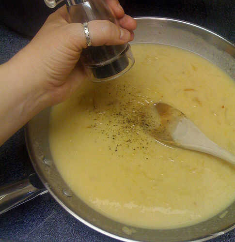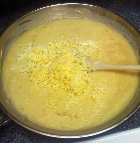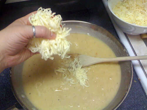Añadir el queso mixto, un puñado a la vez, revolviendo después de cada adición hasta que el queso se derrita y la salsa esté suave. Moler en algunos pimienta rallar en aproximadamente 1/4 cucharadita de nuez moscada y aplastar el tomillo en la mano antes de agregar a la salsa. Probar la salsa y ver si necesita sal. Añadir sal si es necesario. Revuelva la salsa. Probar otra vez, para la buena medida. Queso Mmmmmm...