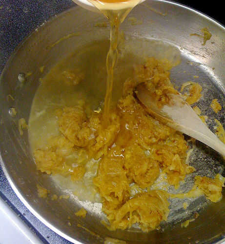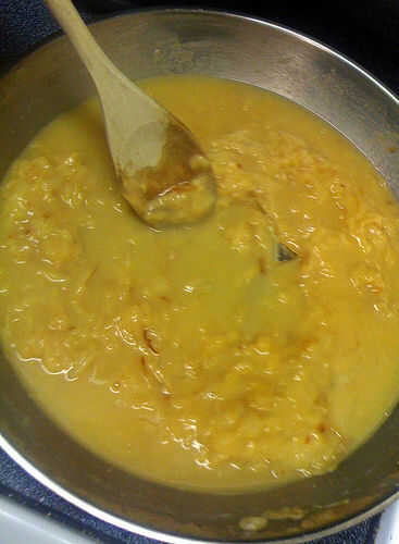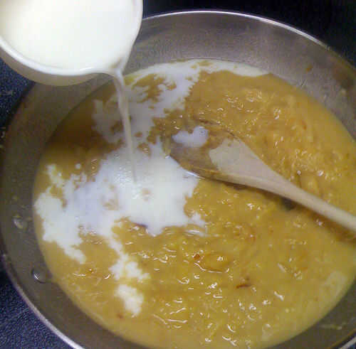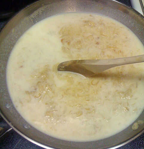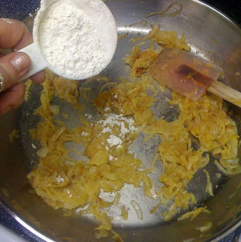 Espolvoree la harina en la sartén con la manzana y la cebolla removiendo. Si es necesario, añadir otra cucharada de mantequilla para incorporar toda la harina. No quiero terrones. Seguir revolviendo hasta que todo se mezcla bien y no ves que harina blanca polvorienta. Agregar la sidra y revolver bien. La mezcla debe espesar rápidamente mientras se calienta para arriba. Cuando lisa, agregue la leche. Seguir revolviendo y cocinar hasta que se formen burbujas. Apagar el fuego.