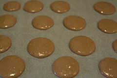 Línea una bandeja de horno con papel de hornear. Cuidadosamente transfiera la masa en una manga pastelera y tubo a los macarrones, asegúrese de que son del mismo tamaño. dejarlos reposar 1 hora (esto es muy importante) ellos hornear durante 10 minutos en un horno precalentado a 180.