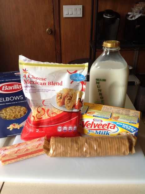 libra 1) 1 paquete de coditos 2) 16 onzas de stick de queso Velveeta 3) 1 de mantequilla 4) 4 tazas de leche 5) 1/4 de libra de queso americano