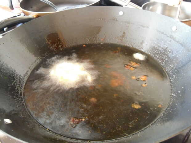 2. en el wok profundo, calentar 2L de aceite de canola (o 2-3inches de aceite) medio hasta llegar a 375degrees (o masa-pruebe la temperatura del aceite: una cucharadita de masa en el aceite de la gota y si listo, la masa debe burbujear inmediatamente hasta la superficie).