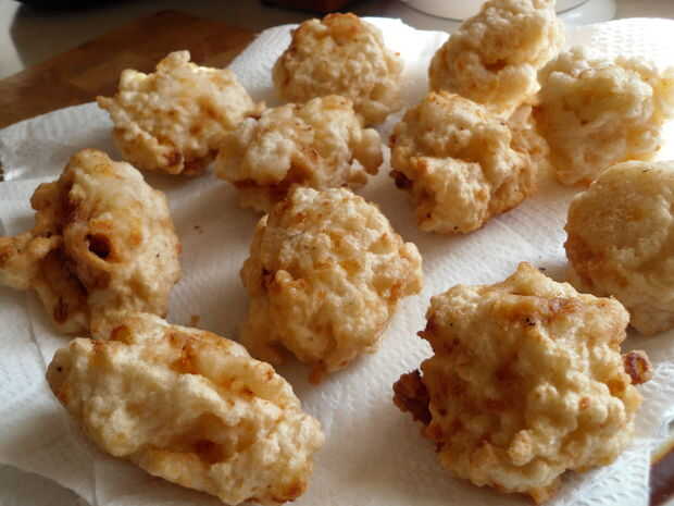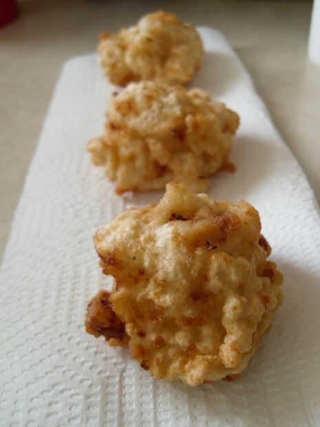 4. Repita el paso 3 para todas las bolas de Mac & Cheese. (Nota: una vez más, no se alarme si las bolas a desmoronarse un poco. Mantenga la calma! Sacar lentamente hasta el Mac y queso pedacitos con la cuchara grande y si las piezas son todo cubierto en masa entonces la bola es siguen siendo toda una vez profunda frito ^_^)