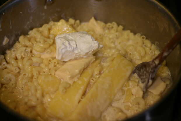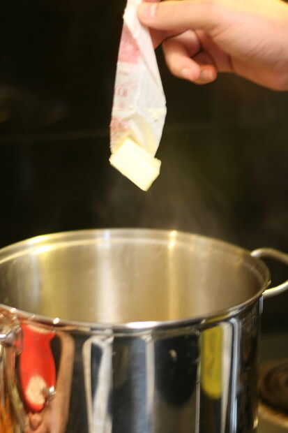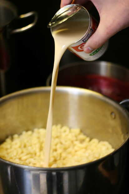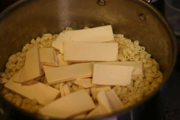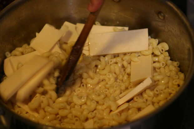 Añadir la mantequilla y la leche evaporada a tallarines, mezclar hasta que se derrita la mantequilla