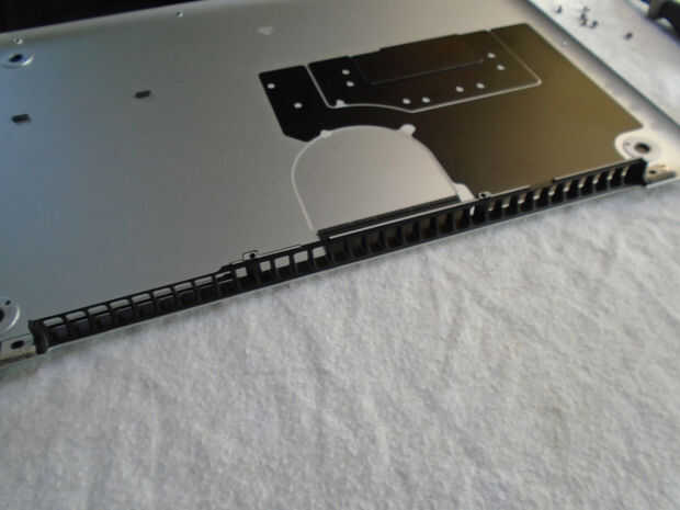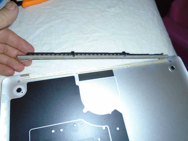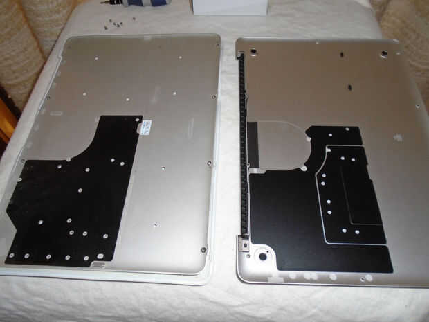 La parte inferior de la Macbook pro tiene una rejilla de los funcionamientos a lo largo del borde más cercano de la pantalla. Esto se pega en y tiene que ser eliminado. Se puede ver en la segunda foto el interior de ambos fondos son muy similares.