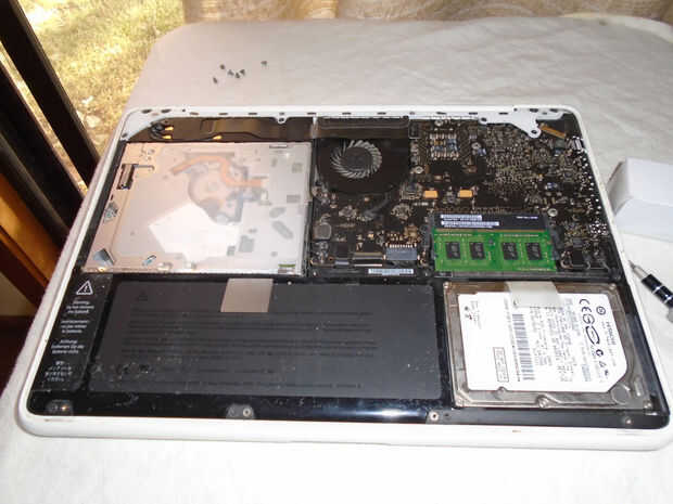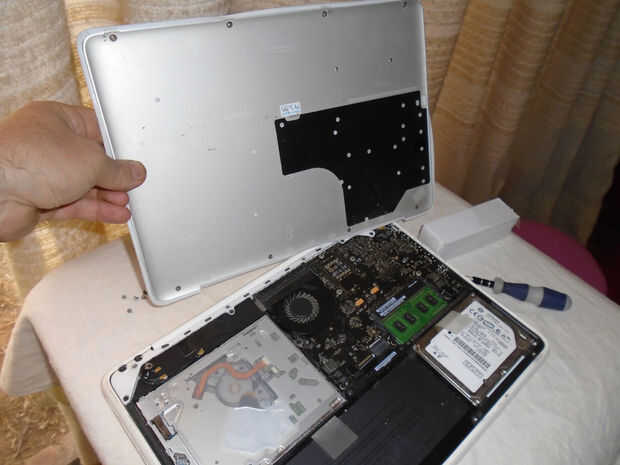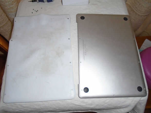 Extirpación de la parte inferior sólo requiere un pequeño Philips destornillador y hay ocho tornillos a quitar. El fondo tiene también tres clips de fijación, pero sólo se necesita una pequeña cantidad de la fuerza para liberar los clips, apalancando la parte inferior abierta.