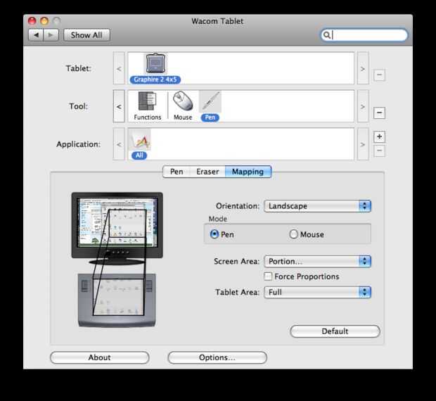 Con la pluma seleccionada, elija la ficha de asignación. "Área de pantalla", elige "Porción." Usted necesitará un mapa donde terminó su sensor. La forma más sencilla que encontré fue a haga clic en el botón "Haga clic para definir el área de la pantalla" y utilice el lápiz para encontrar los puntos de la parte de superior izquierda e inferior derecha a que la pluma podría llegar. Con un pequeño pixel-empujar (edición de los valores de coordenadas en los cuadros) después de eso, tuve una buena pelea. Cada vez que cambia un valor, se sentirá como usted está recibiendo un cambio inmediato en la asignación, pero lo es no realmente haciendo terriblemente con precisión hasta que usted haga clic en Aceptar después de que has hecho un cambio.