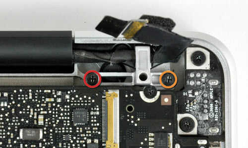 • Eliminar los siguientes dos tornillos del soporte de cable de datos de pantalla:
