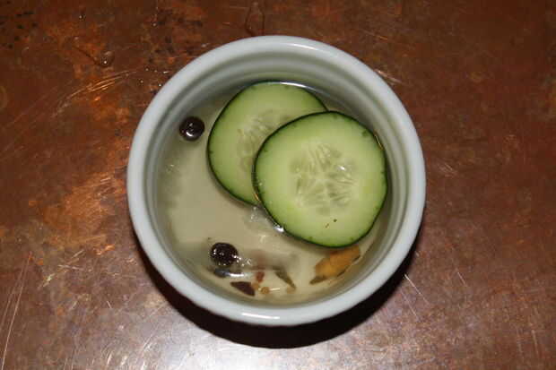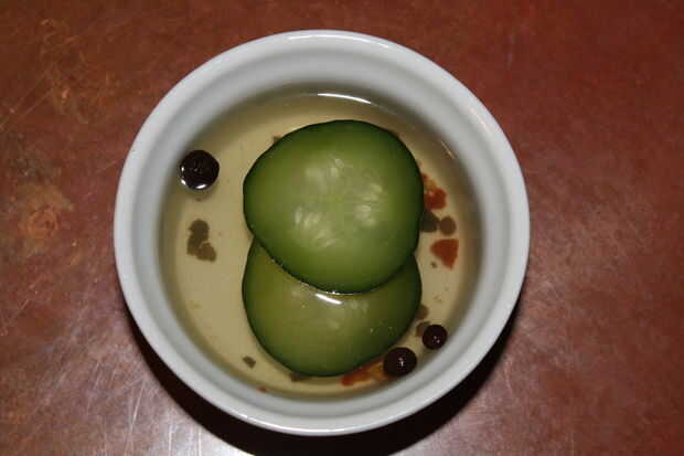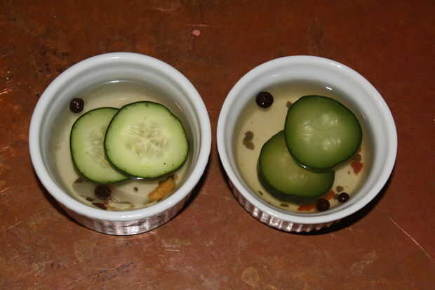 • Dejar las rodajas de pepino en la salmuera y ponerlas en la cámara de vacío.  Debe tomar unos minutos para los pepinos absorber suficiente salmuera para hacer encurtidos.
