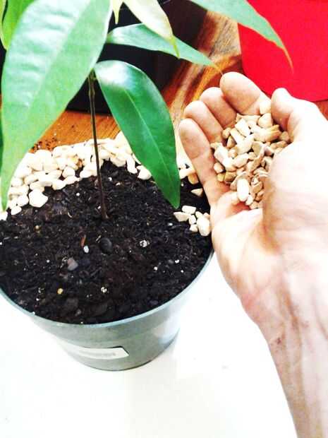 cubrir las raíces, hasta justo donde comienza el tallo. Ahora puede añadir una capa de roca alrededor del borde de la maceta. no sólo estéticamente es este atractivo, pero también actúa como mantillo, manteniendo el suelo húmedo para ya. menos tiempo de riego requerido además de que también mantiene el suelo intacto mientras agua. menos derrames siempre riego.