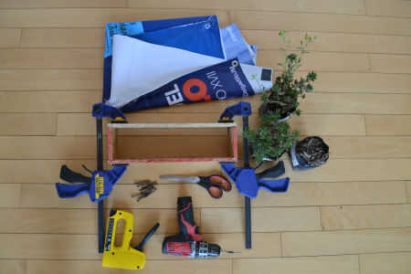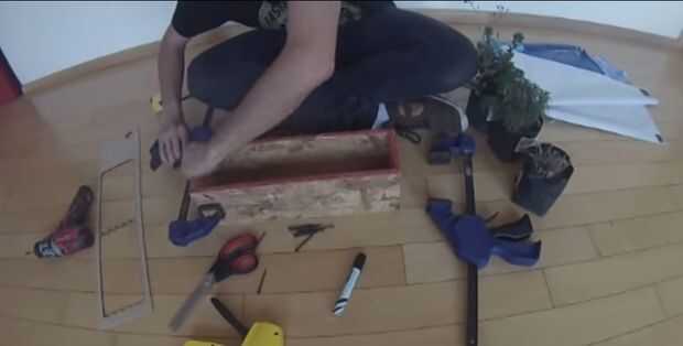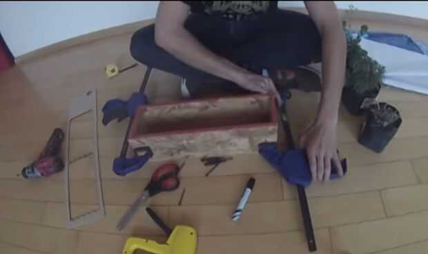 Comenzaremos, los laterales de la maceta ya están previamente cortados y medidos (2 maderas del mismo tamaño para el ancho y otras 2 para el largo). Las acomodamos y sostenemos con cualquier cosa tengamos a la mano.